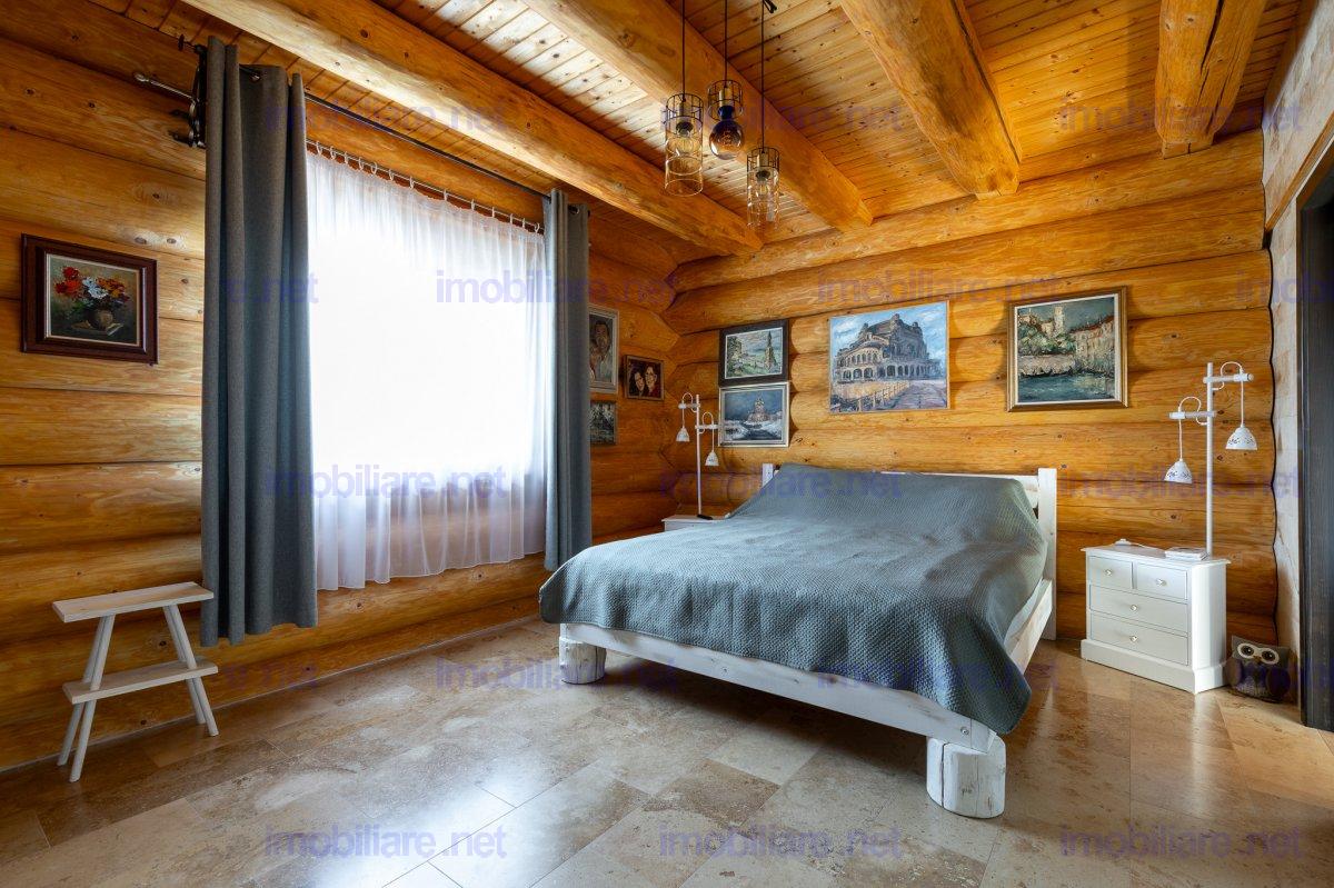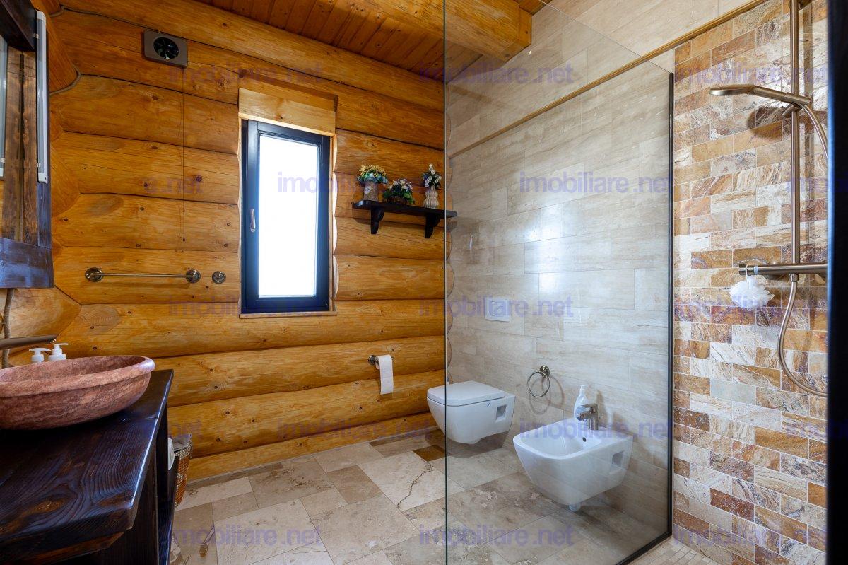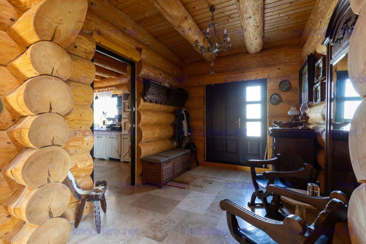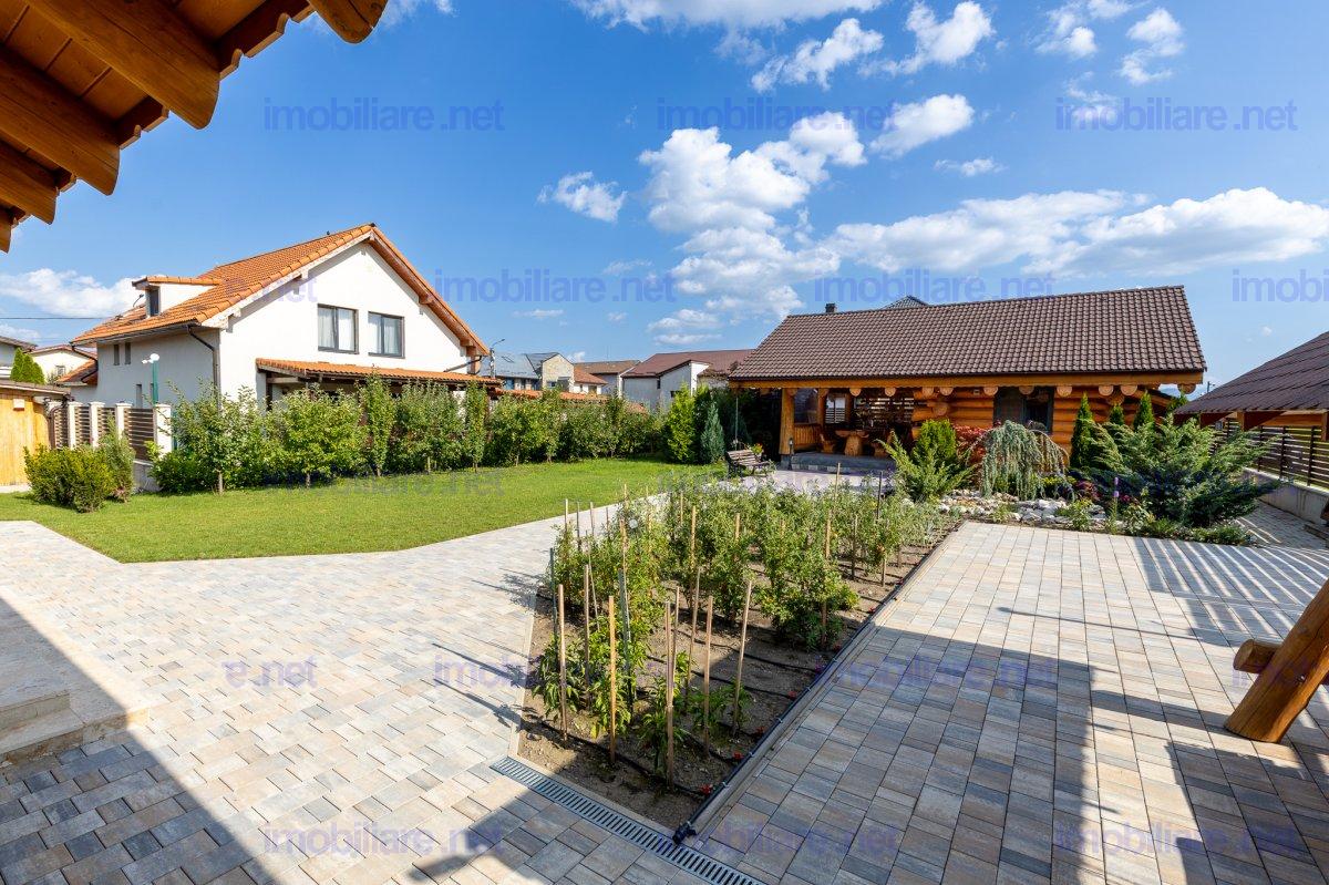 Refugiu canadian din lemn masiv – oaza premium la 10 min de Brașov Imaginați-vă cum ar fi să vă treziți în mirosul cald al lemnului natural, cu panorama Munților Ciucaș pe fundal și întreaga curte scăldată în soare. În Hărman, la doar câteva minute de agitația orașului Brașov, vă așteaptă o proprietate spectaculoasă, creată pentru cei care nu acceptă compromisuri; De ce această casă este unică • Construcție canadiană din lemn masiv – eficiență energetică superioară, aer sănătos și o estetică inconfundabilă. • Travertin natural pe fațadă, soclu și în toate zonele interioare traficate, pentru un look de revistă care rezistă în timp. • Suprafață totală teren 1.200 m² – grădină matură, curte pavată, terase generoase și două accese auto independente cu porți automatizate. • 314 m² construiți (354 m² utili) împărțiți ideal între: • Casă principală (179 m²): • living luminos cu ferestre ample • 2 dormitoare (master cu baie privată & dressing) • baie de oaspeți elegantă • bucătărie + cămară, cameră tehnică • etaj open-space de 70 m² – gata să devină home-office, sală de fitness sau încă două dormitoare • Casă de oaspeți (66 m²) cu terasă acoperită, bucătărie completă și beci tip cramă – locul perfect pentru musafiri sau chirie Airbnb. • Garaj + magazie (69 m²) cu toaletă proprie și generator automatizat – liniște totală în caz de pene de curent. Tehnologie & confort de top • Încălzire în pardoseală Rehau în toată casa, controlată de pe telefon. • Două centrale (gaz + electrică de rezervă) în anexa pentru independență maximă. • Sistem video 12 camere, unele cu audio, plus iluminat exterior inteligent – siguranță 24/7. • Irigare automată cu rezervor pluvial de 6.000 l – gazon mereu verde, costuri minime. Stil de viață • Terasă principală orientată spre sud-vest – apusuri superbe la fiecare cină. • Bucătărie de vară complet echipată + barbeque, ideală pentru petreceri. • Curte plană perfectă pentru piscină, teren de joacă sau grădină bio.