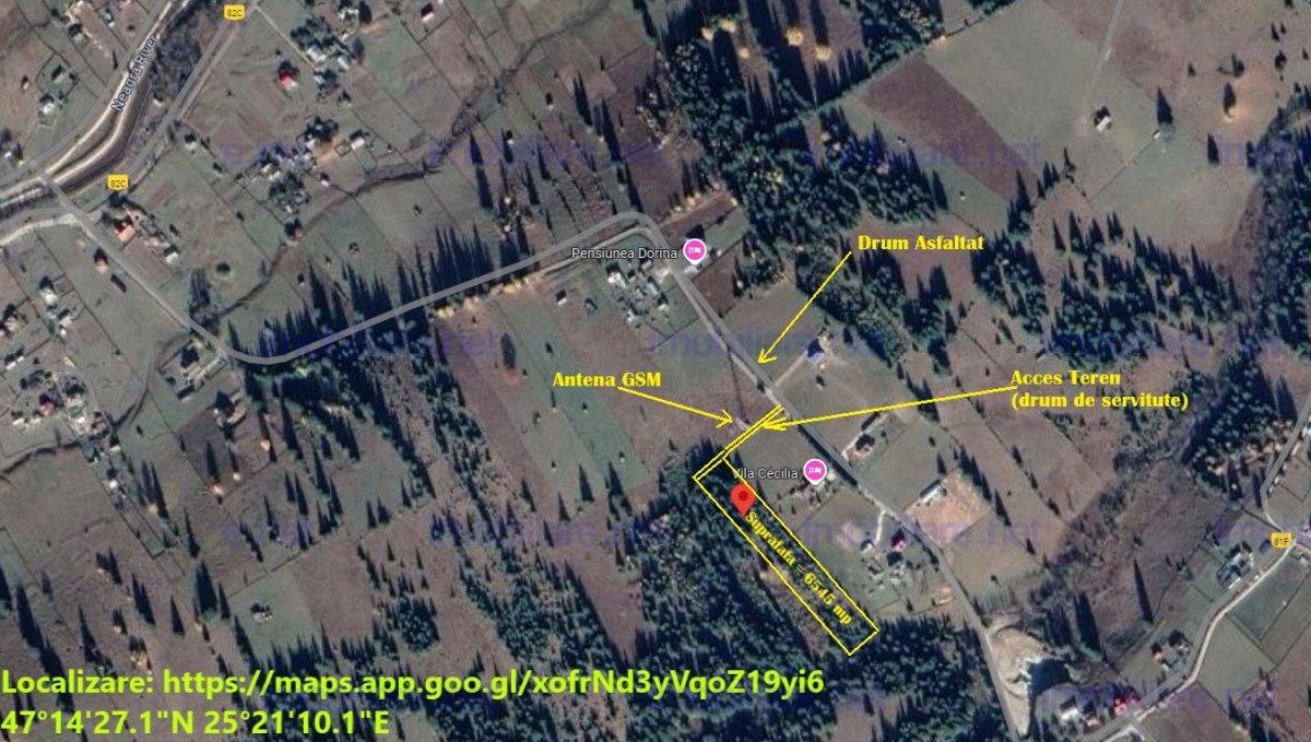 Vatra Dornei - Saru Dornei, Teren S = 6450 mp; La 13 km de Vatra Dornei si la 6 km de Parcul National Calimani Teren spectaculos, aproape de primaria din Sarul Dornei. Acces pe drum asfaltat. Categoria de folosinta: Fanat (extravilan) – se poate introduce in intravilan suprafata ce va fi construita (conform proiect/PUZ) Apa potabila: izvor sau apa curenta la limita terenului (terenul invecinat). Curent electric la limita terenului (teren invecinat). Panta usoara de max 5%, apa nu balteste, iar in zona sudica, in apropierea paraului, panta este mai accentuata (nu exista pericol de inundare in situatia in care sunt ploi abundente pentru o perioada mai lunga de timp). Zona excelenta pentru dezvoltare turistica: sunt 2 pensiuni la mai putin de 400 m de acest teren. Peisaj extraordinar, pozitionat excellent, terenul se preteaza pentru constructia unei pensiuni sau poate fi amenajat pentru 1 – 2 proprietati (casa de vacanta) cu amenajari spectaculoase. La limita sudica este un parau (nu creaza pericol de inundare) iar terenul are foarte multi brazi si vegetatie (nici un fel de activitate s-a desfasurat pe acest teren din 2000). Se poate integra un imobil cu mentinerea/amenajare vegetatiei existente (amenajare peisagistica). Pe fotografia din 2005 se poate vedea (marcat) cursul paraului la marginea sudica a terenului. Acum vegetatia a crescut si este mai greu identificabil in foto. La est sunt case de vacanta/pensiuni Partie de schi in zona, la 2 km, plus alte 3 partii de schi in Vatra Dornei (13 km pe drum asfaltat). Vedere deosebita catre muntii Calimani , Piatra Taieturii , Giumalau . Tel: 0790 544 745 Email: marian.barbu33@yahoo.ro Localizare: Vezi marcaje foto in anunt – si relativ la antena GSM ( marcata pe foto) Link - https://maps.app.goo.gl/xofrNd3yVqoZ19yi6 Coordonate: 47°14'27.1"N 25°21'10.1"E Pret teren: 6 euro/mp (nu este negociabil) Numai Vanzare – exclus schimburi!